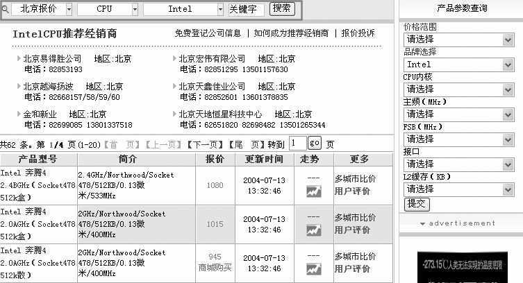 M牛提示:如果知道某个配件的名称、型号以及其他信息,那么可以在查询区域的“关键字”中输入相应的内容,比如赛扬4、奔腾4等等。大家还要注意的是,通常网上的报价比本地的报价要高一些。