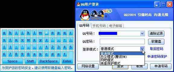 你只需点击“软键盘”按钮就会在屏幕上出现一个软键盘,然后用鼠标选择字符便可输入,这无疑是一种更安全的密码输入方案,让那些键盘监听软件见鬼去吧!