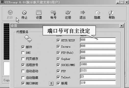 果冻在CCProxy主界面上点击工具栏中的“设置”按钮,在弹出的“设置”窗口中查看到了各协议所对应的端口设置(图1)。