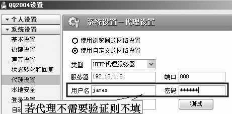 QQ在局域网中的使用一直是普通局域网用户的烦恼之一,但是从QQ 2000C(Build1230)开始,HTTP代理服务器被支持,这对广大的用户来说算得上是一个福音。以QQ 2004为例,在QQ面板上点击“菜单→系统设置→代理设置”,在右侧的设置窗口中点击“使用自定义的网络设置”选项,并将代理服务器信息填入即可(图2)。