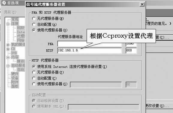 草莓碰到的用RealOne Player无法播放在线电影的情况便是因为客户机上的RealOne Player没有正确设置代理所造成的。其实,只要稍加设置便可以搞定。依次点击RealOne Player菜单栏中的“工具→首选项→代理服务器”,在右侧窗口中点击“更改设置”按钮,进入“信号流代理服务器设置”窗口。对于RTSP代理,单击“使用代理服务器”,根据CCProxy中的设置填入相应的服务器地址和端口号即可。对于HTTP代理,则可以直接使用在IE浏览器中设置的代理服务器(图3)。