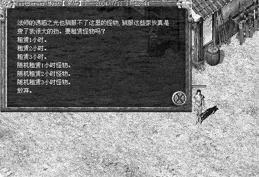 可租赁的怪物分两种:一种是11级以下的怪物,以骷髅洞里面的怪物为主;一种是11级以上的,以沃玛里面的怪物为主。怪物可租1~3小时,每个时段和每种怪物的价格都不一样。也可以随机租赁怪物。目前笔者还不能确定里面具体有哪些怪物。