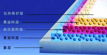 热转移打印使用的是专用的打印纸──热感自动彩色(TA,即Thermal Autochrome)打印纸,这种特殊的打印纸包括5个分层(图1),在中间分别是黄、品红和青色染料层,而顶部则是抗热保护层,最下面则是基层,其工作原理是通过不同温度的传递,来诱发色层的出现。当打印时,刚刚加热的打印头由于温度较低,打印纸染料层中最上层的“黄”会最早反应,然后打印纸会移回去,同时启动UV紫外光,从而固定黄色层;第二步,中等温度的打印头会激活“品红”染料层,接着由UV紫外光固定一次,最后高温的打印头会激活“青色”染料层, “青色”染料层不需要UV紫外光就可以固定了。这样染料层中的颜色就释放出来,从而形成了清晰的图像。