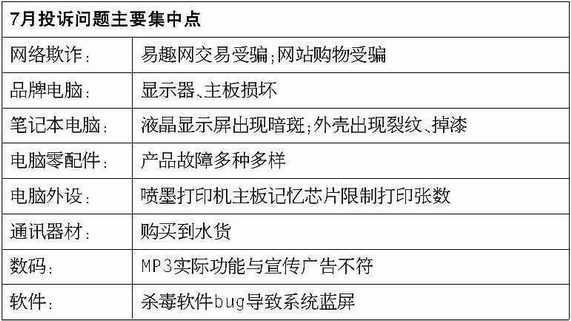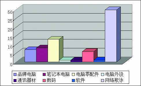 由于我们在6月28日报道了江苏读者王迎新在www.huaxin999.com华信集团电子商务网站订购物品受到欺骗一事,激起了读者强烈的反响。在7月的82起真实投诉中,网络欺诈类投诉高达45件,占了总投诉量的一半。此外,品牌电脑类投诉为7件、笔记本电脑类投诉为8件、电脑零配件类投诉为13件、电脑外设类投诉为1件、通讯器材类投诉为1件、数码类投诉为6件、软件类投诉为1件。其中,电脑零配件投诉占据总投诉量的15.8%;笔记本电脑类投诉占据总投诉量的9.8%;加上网络欺诈类投诉占据的54.9%,这三项的投诉占本次统计的总投诉量的八成,显示为近期消费投诉热点。