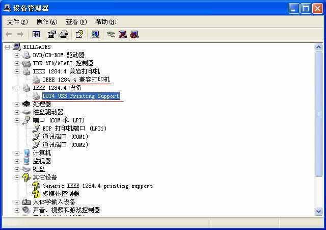 强行手动添加打印机后不能打印。进入设备管理器,发现与打印机有关的有两项(如图),先更改IEEE 1284.4 兼容打印机驱动后,问题不能解决。