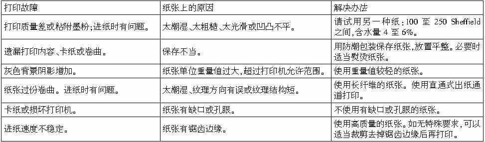 普通纸打印故障的排查 整机外设 刘英梅 · 2004年7月26日 在打印中因普通纸张造成的打印故障并不少见。 一般而言笔者都使用规范的 20 磅 (75g/m2) 纸张并确保纸张质量优良,没有切口、缺口、撕裂、污点、碎屑、灰尘、皱褶、孔隙、卷曲或折边等。而普通纸打印中因纸张原因造成的故障具体现象、原因和解决方法如下表,大家可以按此排查故障。