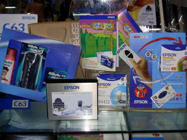 和造假游击队出点车费钱收购废旧墨盒不同,厂商的这些活动可是下了本钱的,例如EPSON开展活动的展台,百通就看见了不少让人留口水的奖品(如图),例如吉列剃须刀、旅行包等。而得到这些奖品的方法很简单,凭借原装墨盒到柜台来,根据上交的原装墨盒数量、型号来换取不同的奖品。