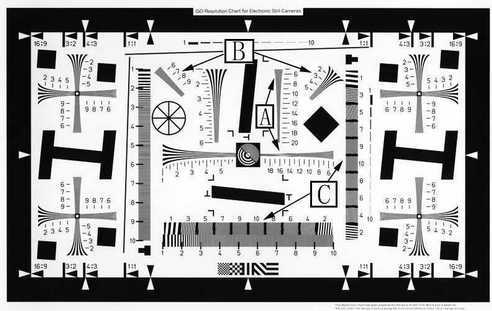 该测试主要反映相机在水平、垂直、倾斜角度下的分辨率,这里我们用标准测试卡──PIMA/ISO 12233分辨率测试卡(见下图)。图中A区指向分别为垂直方向和水平方向,曲线为两头稀疏中间紧密,曲线旁边有数字刻度,表现曲线的密集程度。标准测试卡宽长为20cm×35.6cm,卡中刻度显示为标准卡的1/1000,比如刻度为10,那么它对应旁边的线宽为20×1/1000=0.02cm,A区最大刻度为2000。B区为倾斜45度角的收敛曲线,判断和计算方法与A区域相同,该区域的最大刻度为1000,C区域则是斜5度角的平行曲线。由于拍摄的相片过于精细,通过肉眼来分辨难免有些偏差,为保证数据的精确,我们在Photoshop中用魔术棒来划分图中曲线之间的临界点,经过我们多次变焦拍摄取平均值,得到的测试数据如下: