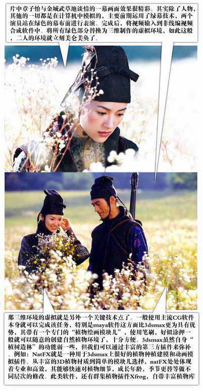 片中章子怡与金城武草地谈情的一幕画面效果很精彩。其实除了人物,其他的一切都是在计算机中模拟的,主要前期运用了绿幕技术,两个演员站在绿色的幕布前进行表演。完成后,将视频输入到非线编视频合成软件中。将所有绿色部分替换为三维制作的虚拟环境,如此这般,二人的环境就立刻美妙绝伦了。