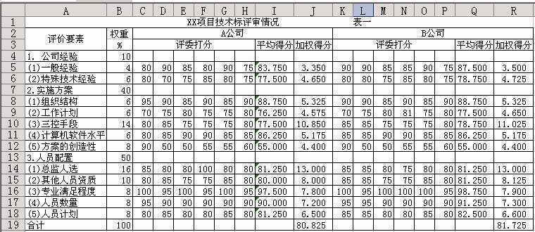 应用思路:计分过程主要涉及技术标评分、商务标评分和综合得分三部分。我们根据需要分别建立如下三个表格。其中表一(图1)为了直观明了,评价要素只列举了12条,评委只有6人,并且有5家公司参加本次评标而图表只列举了A、B两家公司。大家可根据需要自行确定,由此引起的数据处理过程和方法基本相同。表二、表三合并在一个工作表上,即第二个工作表(图2)。