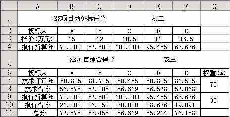 表三:在B7单元格输入公式5,其他四个单元格可类比输入。在B8单元格输入公式6,将公式横向复制到相应单元格。报价折算分可直接引用第4行数据,即在B9单元格输入公式7或“= B4”,将公式横向复制到相应单元格。报价得分可参照技术得分输入。