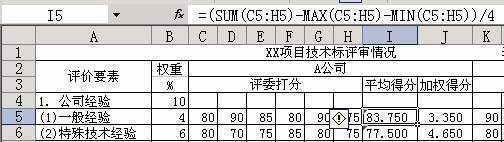 公式1:=(SUM(C5:H5)-MAX(C5:H5)-MIN(C5:H5) )/4