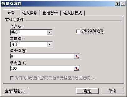 Step2 选中“设置”选项,在有效性条件中的允许数据类型里选择整数,接着输入逻辑判断值介于0和100之间。这样,在输入分数时,只能输入0和100之间的数值,否则将提示输入值非法,要求重新输入。
