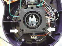 针对杆力过大的问题,通过减小弹簧张力的办法来解决。由于这款摇杆的弹簧是在底座里面的,必须拆开底座,其中黑色的方块就是万向调节组件,拧下箭头所指的螺丝,取下底盖就可以看到弹簧。要减小弹簧的张力就必须缩短弹簧的长度,缩短长度有两种方法,一种是将弹簧剪去一圈(普通的老虎钳剪不动,可以用钢锉将它锉断),不过剪了就没办法恢复了。另一种方法就是将相邻的两圈用线绑在一起就能缩短弹簧的长度。缩短后的弹簧自然长度在4.5厘米左右就可以了,不能过短,不然力量太小会影响摇杆的回中。