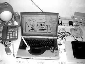 现在,我的绘画工具是一台带刻录功能的迅驰宽屏笔记本电脑和一套WACOM压感笔。一个点子想好之后,我先是用铅笔在纸上打草稿,草稿极“草”,只有我自己能看明白,主要有个分镜头和大体框架就行了,然后在电脑里用压感笔绘制精细的草稿。