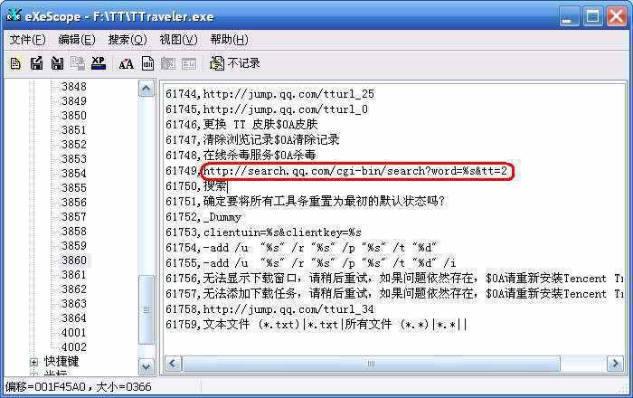 忽然,笔者想到了功能强大的eXeScope(自定义应用软件工具),于是迅速下载了最新的6.50汉化版本回来进行安装,首先当然是关闭TT浏览器,然后在eXeScope中打开TTraveler.exe文件,从左侧列表中找到“资源→字符中”中的3860,如图2所示,现在只要将右侧窗格中的“61749”条目逗号后的内容更改为“http://www.google.com/search?q=%s&hl=zh-CN&lr=lang_zh-CN&ie=gb2312”,保存后即可解决问题。朋友们如果有同样烦恼的话,不妨按照笔者的办法去试一试。