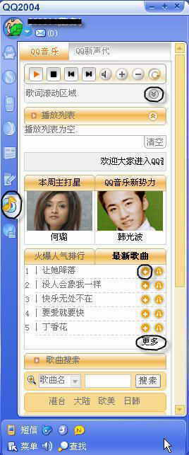 QQ在线音乐不但具有音乐播放的基本功能,而且在“歌词滚动区域”会即时滚动显示曲目歌词,好听的歌当然要学着哼两句喽。在下方集成的“火爆人气排行”和“最新歌曲”两个栏目也颇有新意,通过它们我们可以随时把握音乐潮流时尚,好歌新歌享之不尽。首先启动QQ2004 Beta版,点击主界面左侧QQ音乐图标(如图)。切换至QQ音乐面板后,点击下方“火爆人气排行”中歌曲右侧的加号,此曲即自动排在了播放列表中。点击“更多”按钮,会弹出“QQ音乐中心”窗口,在其中你可以用同样的点击加号添加更多曲目,最多可以添加20首。在此窗口中,你还可以点击上方的“推荐歌曲”按钮,选择QQ推荐歌曲。选择完成后点击主界面上方的播放按钮即可。