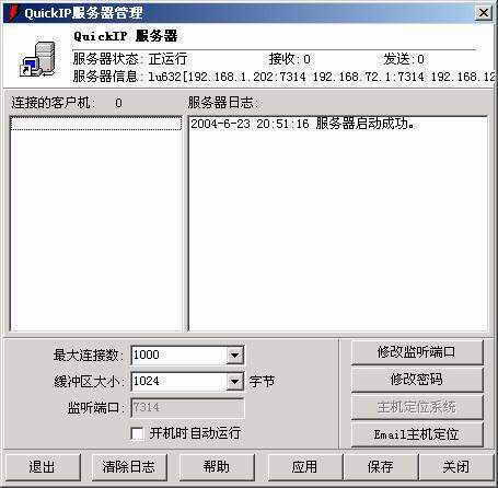 在成功设定密码后,就可以看到QuickIP的服务器管理窗口了,从右侧窗口中可以看到服务器已成功启动的提示信息(图1)。
