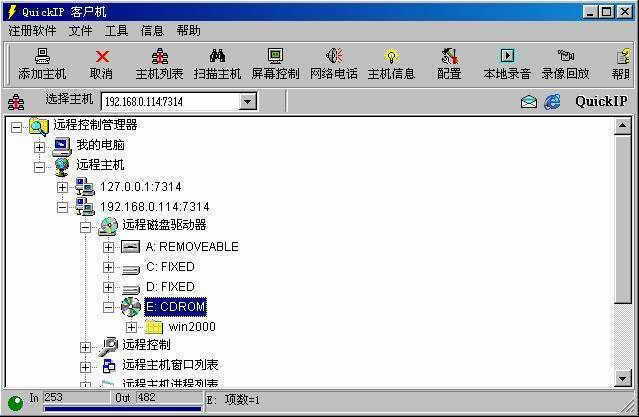 双击被控主机IP,展开可控资源列表,打开“远程磁盘驱动器”,在输入被控主机的密码后,QuickIP将会以树状目录的形式展示远程计算机的所有磁盘驱动器。点击光驱,我们可发现光驱中放的是内容为“Win2000”的光盘。显然QuickIP对远程计算机的光驱和其他驱动器具有很好的控制能力。