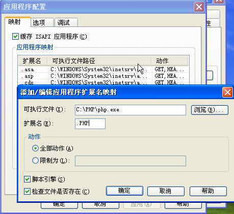 在应用程序配置对话框中点击“添加”,弹出“添加/编辑应用程序扩展名映射”对话框,在“可执行文件”栏中输入php.exe的路径,“扩展名”中输入“.PHP”,其他选项使用默认设置,点击“确定”按钮。这样我们的IIS服务器就能支持PHP了。
