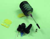 打开包装盒,发现里面的内容真不少,从塑料袋中一一将它们取出,图1中从左到右分别是封条(用来密封墨盒气孔)、手钻(在某些墨盒上打注墨孔)、气泵(对注墨孔打气)、推珠工具、钢珠(封闭注墨孔)、带针头的墨水瓶。另外,还附送了一个塑料手套,避免填充墨水的时候把手弄脏。