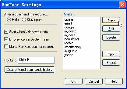右键单击系统栏上的RunFast图标并从弹出的菜单中选择“Settings”命令进入RunFast设置窗口(如图)。在这里,我们可以添加、修改、删除自定义命令。