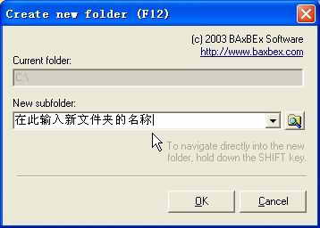 运行软件后,单击资源管理器工具栏上新增的“New Folder”按钮或按F12键,并在随后弹出的窗口中输入文件夹的名称即可快速在当前文件夹下新建一个文件夹(如图)。