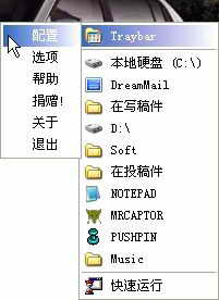 单击TrayBar菜单中的“TrayBar→配置”命令进入TrayBar菜单配置窗口,在这里,我们可以添加、删除、修改TrayBar菜单中的命令。