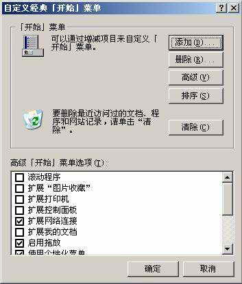在开始菜单属性中,我们可以根据自己的实际情况来定制属于自己的开始菜单,一切为了更方便地操作Windows。点击“开始”菜单的自定义按钮,就可以看到打造开始菜单的选项了(图5)。常规方法要在开始菜单中添加任意文件或文件夹以及程序的快捷方式,就要点击“添加”按钮,选择你使用频繁的快捷方式,可以根据你的喜好把它直接摆放在开始菜单中,或者在开始菜单的其他选项下。