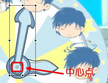 2.选中两个指针的图片,按F8键转换成影片剪辑,然后用变形工具调整影片剪辑的中心点,到它的底部,两个时钟的指针都要调整(图3)。