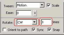 3.然后在时针和分针所在的图层,第60帧按F6键建立关键帧,继而建立动画,然后在属性面板中,将Rotate选项选为CW,让它顺时针旋转,在后面的输入框中输入1,也就是60帧转一圈(图4)。将分针使用同样的设置,只是旋转次数上输入12。