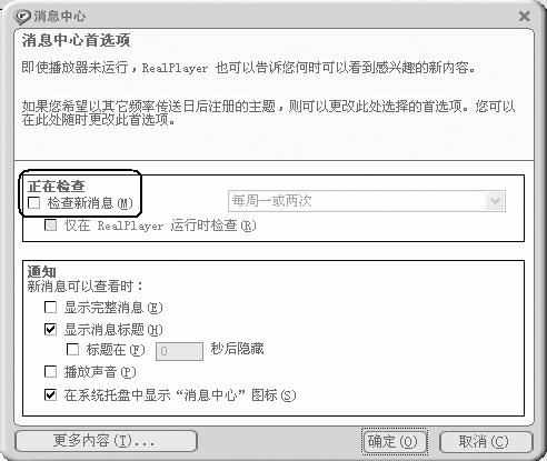 直接在任务管理器中结束该进程服务的方法行不通,随着RealPlayer的再次启动,它又会出现。这里笔者给出一个可以彻底解决该进程的方法。首先打开RealPlayer,单击“工具”→“首选项”,在“首选项”窗口,分别去掉“自动服务”中“检查最新下载的媒体,添加到我的媒体库”和“自动更新”中“自动下载和安装重要更新”前的复选框,按“确定”。然后在“首选项”窗口“自动服务”中“Real消息中心”点击“配置消息中心”按钮,在弹出的“消息中心”窗口中去掉“检查新消息”前的复选框(如图),按“确定”,在弹出的警告窗口点击“是”,即可让realsched.exe进程彻底消失。