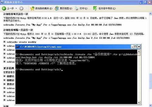 笔者试图用Windows的命令Schtasks建立一新计划任务,按照帮助文件中的范例依葫芦画瓢,输入:schtasks /create /tn “备份数据库” /tr g:\jjhkdatabase\backup.bat /sc daily /st 16:00:00 /sd 06/22/2004 ,结果却出现“日期”格式有误的提示。原来帮助文件中的日期误写成“mm/dd/yyyy”类型的,而正确的日期格式必须是“yyyy/mm/dd”(见图)。 线索提供者:周玲生
