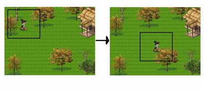 图9就是一个例子,假设图中黑色方框才是屏幕能显示的大小,那如何让人物从场景的左上角走到场景的中央呢?请看下面的示例: