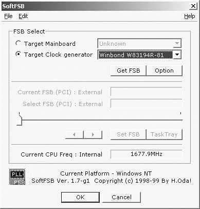 SoftFSB是一款比较通用的软件(图8),它可以支持几十种时钟发生器。只要按主板上采用的时钟发生器型号进行选择后,点击GET FSB获得时钟发生器的控制权,之后就可以通过频率拉杆来进行超频的设定了,选定之后按下保存就可以让CPU按新设定的频率开始工作了。不过软件超频的缺点就是当你设定的频率让CPU无法承受的时候,在你点击保存的那一刹那导致死机或系统崩溃。