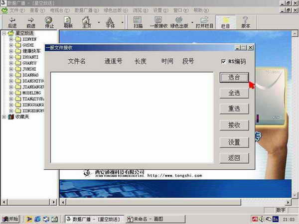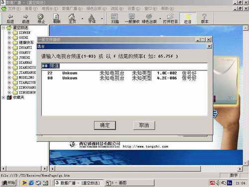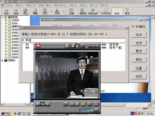从桌面或程序菜单中启动通视信息软件的“数据广播”,选择工具栏或主菜单“数据广播”下的“一般接收”出现选台窗口。再选择“选台”出现频道输入对话框,在对话框中输入要看电视的频道(可以收看1-83频道的电视节目)或输入要看的 电视频道所对应的频率数值并以f结尾(如65.75MHz的1频道则输入65.75f),再按“确定”。如出现“无图文、电视信号”提示,表示该频道为空,只需重新输入电视频道;如出现“只有电视信号,没有图文信号”则不必理会提示,按确定即可。