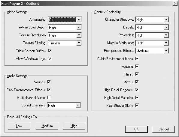 “Decals”设定是否在游戏中出现弹孔和血污,它们既耗费资源,意义也不大,三块卡建议都设置成Low。“Projectiles”仍是一个效果选项,控制枪战时产生的碎片和子弹弹壳,因为这些都是动态产物,对资源占用较大,建议三块卡都选择Medium。“Material Variation”决定了射击时的渲染效果,作为一款以枪战为特色的游戏,建议三块卡都设置为High。“Post-process Effects”对Max Payne2来说是最重要的效果设置了,它控制了动态模糊和子弹时间效果的渲染,完整的子弹时间效果渲染最少需要像素渲染1.1的支持。建议NV5200使用Medium,NV5700LE和ATi9550使用High。