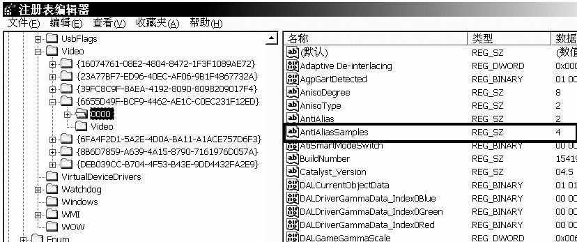 2.在注册表中查找HKEY_LOC AL_MACHINE\SYSTEM\CurrentCo ntrolSet\Control\Video\{GUID}\0000这个分支,我们会发现有若干个仅GUID不同的分支存在(不同的电脑,分支数量也不相同)。接下来我们就在这多个分支中查找键值为4的AntiAliasSamples键,因为我们已经在第一步中设定AntiAliasSamples键值为4,所以在这个几个分支中必定有一个AntiAliasSamples键值为4的分支为当前活动分支,也就是当前驱动的设置分支。