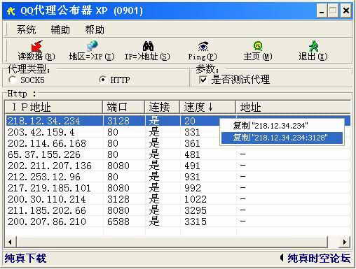 获取代理服务器地址的方法很多,这里笔者推荐使用QQ代理公布器XP(0901),这是一款专门用来探测代理服务器的软件,执行效率相当高,从开始探测到返回一组结果一般只需十几秒。官方下载http://96hk.y365.com。