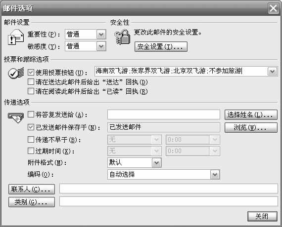 首先,要删除默认的按钮名称,然后输入“海南双飞游;张家界双飞游;北京双飞游;不参加旅游”,注意这里应该是用英文分号将按钮名称分隔开(图1),最后点击“关闭”按钮退出“邮件选项”设置窗口。现在,小王就可以将邮件发送出去了。