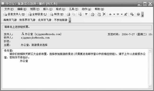员工们收到这封邮件后(图2),除了可以查看到邮件正文内容外,还会在左上角看到增加了“海南双飞游”、“张家界双飞游”、“北京双飞游”、“不参加旅游”等四个按钮,下面还有“请单击上述按钮投票”的提示。大家只要点击相应的按钮,Outlook 2003会询问是否“立即发送响应”,选择“确定”后投票结果会被自动反馈给小王,这样小王统计起来就方便多了。