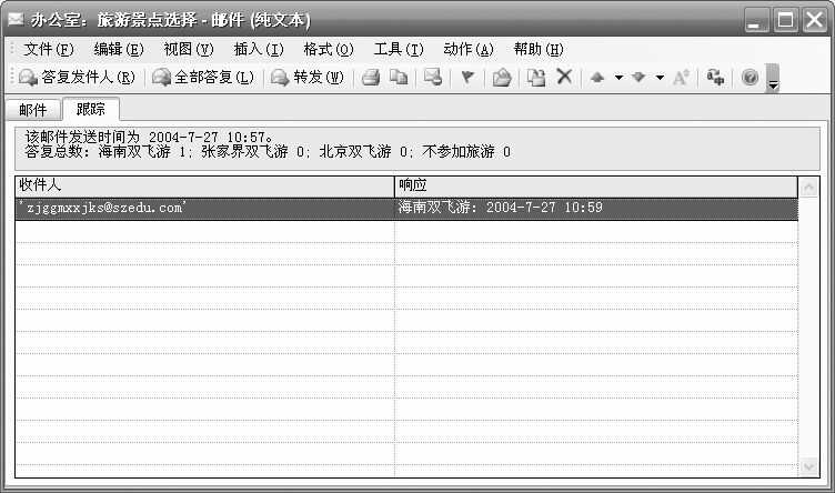 小王从“已发送邮件”文件夹中找到自己发送出去的征询邮件(即原始邮件),切换到“跟踪”选项卡(图3),在这里可以清楚地查看到目前已收到的答复,只要在规定的11点后再次查看,所有的投票结果会自动统计完毕。