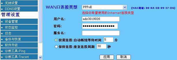 在进行设置之前先将ADSL Modem的WAN口与路由器相连。进入无线宽带路由器的设置页面后,选择“基本设置”。接着,在WAN口连接类型中选择PPPoE连接,然后输入ADSL上网的用户名、密码(图2)。为了避免掉线,还可以进行断线后自动拨号的设置,可以选择“按需连接:自动断线等待时间”(默认5分钟)和“保持连接:重复连接周期”(默认30秒)。最后,点击“应用”按钮,设置即可生效。