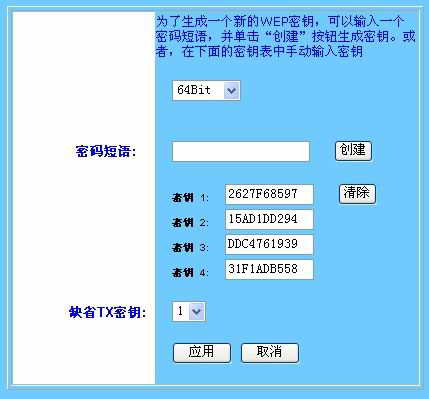 为了保证内网的安全,使没有登录权限的人无法连接已构建的无线网络,可以进行如下设置:首先打开路由器设置页面,选择“基本设置”。接着在“无线设置”区域的WEP设置选项中,选择“开启”。然后,点击旁边的“WEP密钥设置”按钮,在密钥设置窗口中,选择加密的位数(包括64位或128位),点击相应的“创建”按钮来创建密钥。最后,点击“应用”
