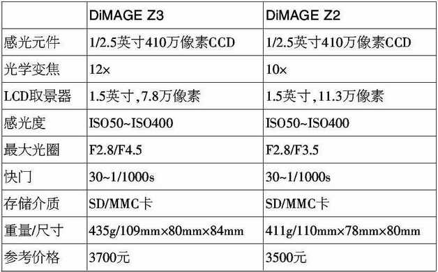不过,随着Z3的入市,Z2的地位将受到极大的挑战。DiMAGE Z3依旧是400万像素,秉承了Z2的诸多优点,例如快速对焦、高速摄像,不过,它的光学变焦倍数提升到了12倍,而且,带有高端的A系列才有的光学防抖系统,这无疑大大增强了吸引力!最为关键的是,Z3的价格非常具有冲击力,报价仅3700~3800元,还有进一步讲价的余地!