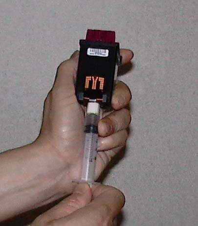 操作技巧提示:对于带墨的一体墨盒,负压清堵时,用力过大会造成墨水浪费。我们也可以逆向操作。方法是,先在注射器中吸入1毫升左右的无水酒精,对准喷嘴,把无水酒精通过喷嘴注入墨盒内(图7)。注意不要在一个喷嘴位置把无水酒精一次性全部注入墨盒;要在不同的喷嘴位置,分次把1毫升无水酒精压入墨盒内。同样,在负压清堵时,也要把所有的喷嘴清洗一遍。