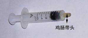 若想只对个别喷嘴进行局部清堵,这时也可以对清堵器的头部做一下加工。方法是,找1厘米长的鸡肠带(自行车气门芯上用的),直接套在注射器的针头部分(操作时,先用清水把注射器的头部弄湿,这样就可以很轻松地把鸡肠带套在针头部分),要保证不能使注射器的针头部分露出(图6)。