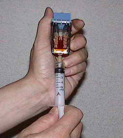 首先把待清堵的喷头,放到适量的纯净水里加温,刚感觉到烫手停止(40℃~60℃,溶墨的时间与水温有关),用药棉蘸上温水,捂在喷嘴处。若堵塞不严重的一般需要10秒钟;堵塞严重的,一般也只需要50秒钟的时间(事实上用负压清堵器,喷嘴不进行预处理,一样可以清堵)。擦干喷嘴处的水渍或墨迹,然后将清堵器的橡皮接触孔垂直对准喷头的喷孔,一只手保持橡皮与墨盒紧密接触,另一只手缓慢抽动注射器拉杆(拉动时应有很费力的感觉;否则表明清堵器与喷嘴接触不良),便可达到清洗喷嘴的目的(图5)。