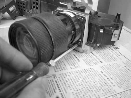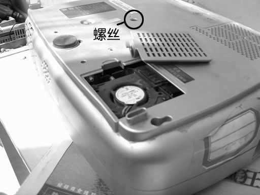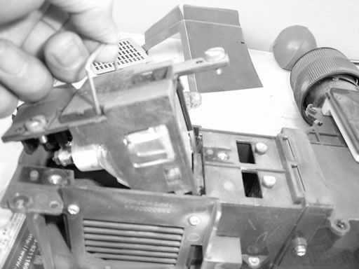 6.分解光机总成:用平口螺丝刀松开两只固定螺丝,取出灯泡(图9),可以看到灯泡舱通向光箱的一面玻璃片积有灰尘,影响了通光量。