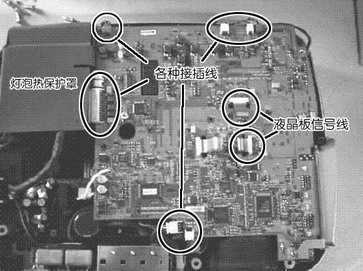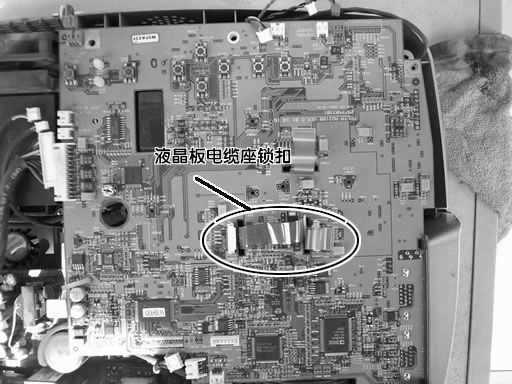 2.卸主板,拿走灯泡上的防护罩。将主板四周的接插线拔除,然后将液晶板上的信号线取下(图2)。扳开液晶板电缆接插件的锁扣,轻轻地取下液晶板电缆(图3)。